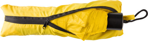 Mini-ombrello manuale in pongee RPET 190T, antivento a 3 elementi ultraleggero (130 g), con 6 pannelli, struttura in metallo, stecche in fibra di vetro, manico compatto con cinturino, custodia in colore coordinato ed etichetta RPET.