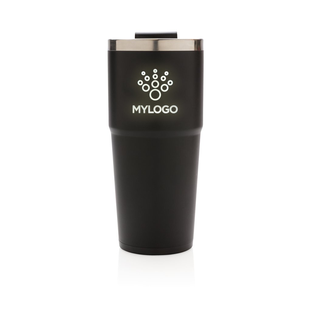 Tazza a doppia parete con interno in acciaio inossidabile 304 ed esterno in ABS. Il logo inciso sulla tazza si illuminerà agitandola. Include 2 batterie CR2032. Capacità 480 ml.
