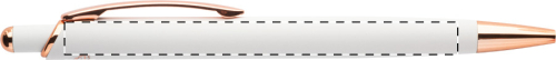 Penna a sfera in alluminio, dettagli in color oro rosa, refill blu e rivestimento gommato speciale per incisione laser a specchio in colore oro rosa.