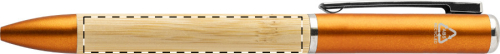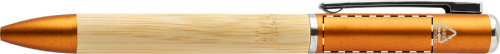 Penna a sfera in bambù e plastica ABS riciclata, meccanismo di apertura a rotazione, 1 torcia LED, refill blu e batteria a bottone.