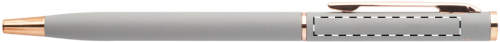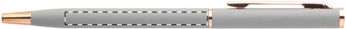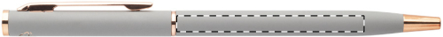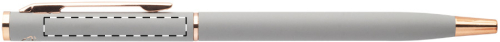 Penna a sfera in alluminio riciclato con meccanismo a rotazione, dettagli in color oro rosa, refill blu e rivestimento gommato speciale per incisione laser a specchio in colore oro rosa.