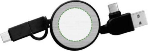 Set cavi per la ricarica estensibile in ABS con dettagli in bambù, include USB Typ C (ingresso e uscita), micro USB e Lightning, confezionata singolarmente in una custodia in carta