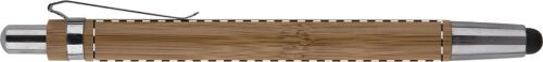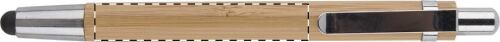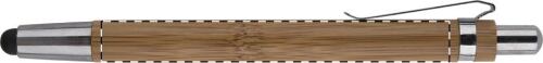 Penna a sfera in bambù con gommino capacitivo per touch screen, clip e punta in metallo. Fornita con refill blu.