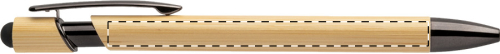 Penna a sfera in bambù con refill blu, dettagli metallici lucidi e pennino capacitivo in colore coordinato.
