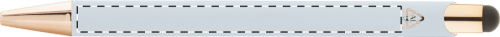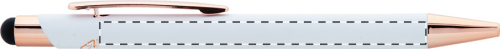Penna a sfera capacitiva in alluminio riciclato con finitura gommata, dettagli color oro rosa e refill blu. Rivestimento speciale per incisione laser a specchio in coordinato colore oro rosa.