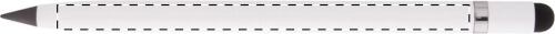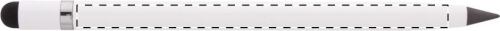 Penna in alluminio riciclato senza inchiostro di lunga durata, con gommino capacitivo e punta in lega metallica che ossida la carta. Questa penna scrive come una matita ed è anche cancellabile. Viene compresa una gomma riposta all'interno della penna.