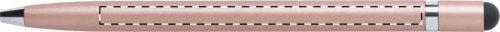 Penna a sfera in alluminio con meccanismo a rotazione, gommino capacitivo e refill blu.