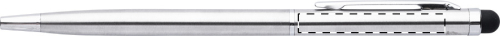 Penna a sfera capacitiva in acciaio riciclato con refill blu, meccanismo di apertura a rotazione e parti cromate.