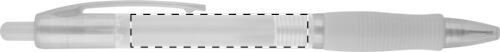 Penna a sfera in plastica con impugnatura gommata. Fornita con refill blu.