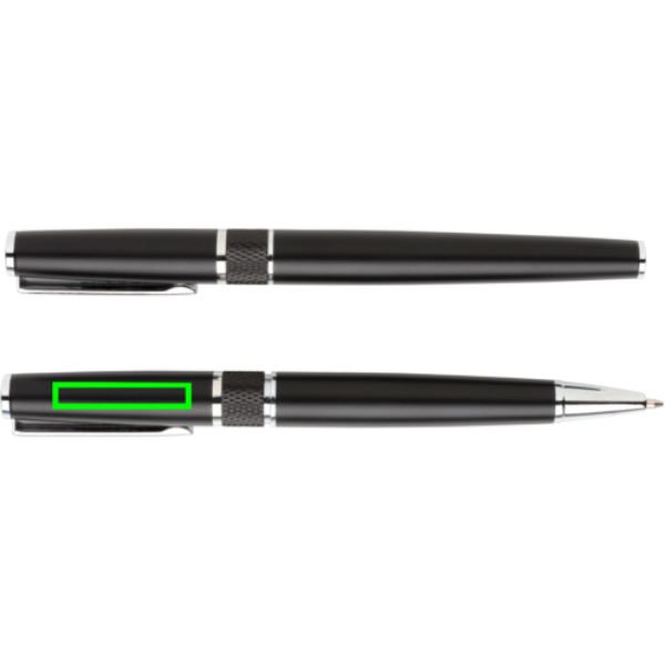 Questo lussuoso set di penne aggiunge eleganza e stile alla tua scrittura. Include una penna a sfera e un roller con inchiostro blu in una bellissima confezione con logo in rilievo. La penna ha refill con inchiostro blu Dokumental con sfera in t/c per una scrittura precisa e scorrevole. Il roller ha refill con inchiostro blu Dokumental. Lunghezza di scrittura circa 1200 metri.
