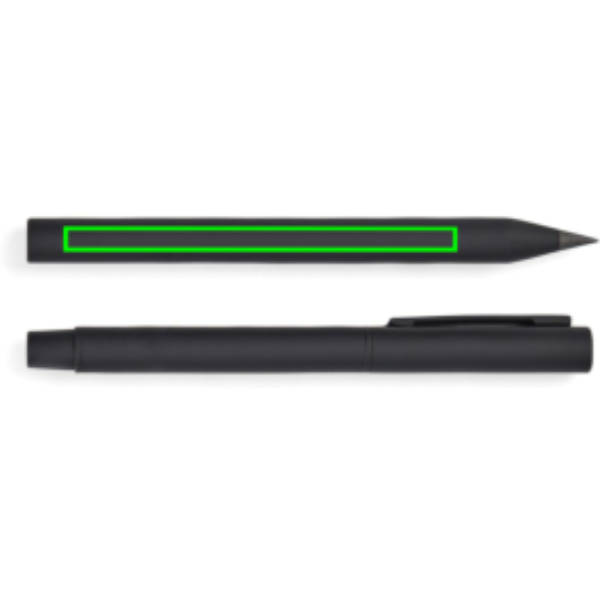 Questo moderno ed elegante set comprende due penne: una eterna e una classica penna a sfera con cappuccio e clip. Progettate per garantire stile e funzionalità, queste penne sono realizzate in acciaio inossidabile riciclato certificato RCS, con un rivestimento superficiale in gomma per una presa confortevole e una finitura opaca. Entrambe le penne hanno un peso bilanciato che garantisce stabilità e scrittura senza sforzo. La penna eterna offre una scrittura senza limiti. La penna a sfera è dotata di una punta fine da 1,00 mm e garantisce una scrittura fluida e costante con inchiostro blu documentale, che dura fino a 1200 metri. La certificazione RCS garantisce che l'intera catena di approvvigionamento dei materiali riciclati sia certificata. Il contenuto totale di materiale riciclato si basa sul peso complessivo del prodotto. Questo prodotto contiene il 52% di alluminio riciclato certificato RCS e il 10% di acciaio inossidabile certificato RCS.