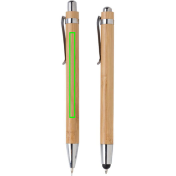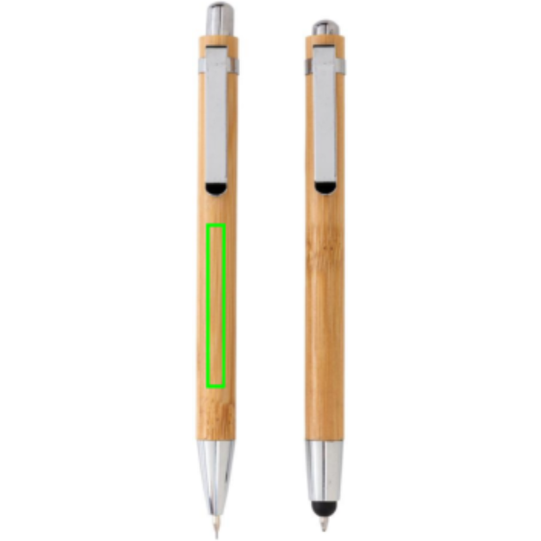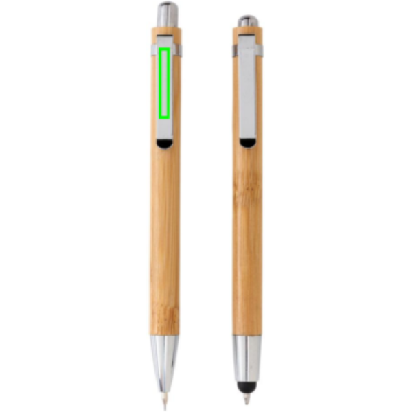Set di penne in bambù in scatola regalo. Include una penna touchscreen con refill blu e una matita con 3 mine da 0,7mm.