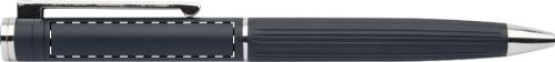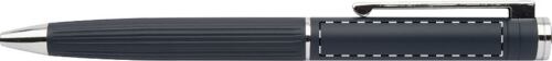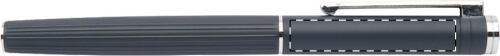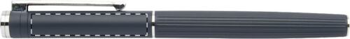 Elegante set composto da una penna a sfera ed una roller con fusto in alluminio testurizzato a righe, in confezione regalo nera e refill blu.