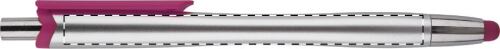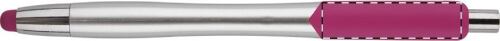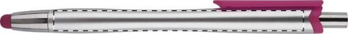 Penna a sfera in plastica con refill blu, con gommino capacitivo sulla punta, corpo argentato e clip colorata.