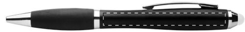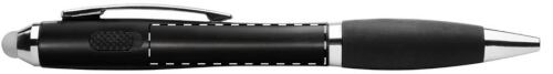 Penna a sfera in plastica nera, impugnatura in gomma, gommino capacitivo e luce a LED in colori coordinati per personalizzazione ad incisione. La luce può essere attivata da un pulsante sul corpo della penna. Fornita con batteria a bottone e refill blu.