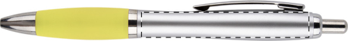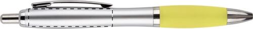 Penna a sfera in plastica con fusto argentato ed impugnatura in gomma colorata. Fornita con refill nero.