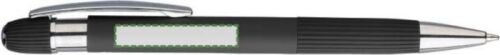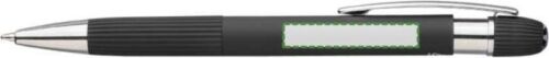 Penna a sfera in alluminio riciclato con finitura gommata, presenta dettagli a strisce sull’impugnatura e sulla parte superiore, punta in plastica cromata, meccanismo a scatto, clip in metallo, refill blu, include logo materiale riciclato inciso al laser.