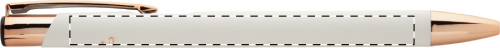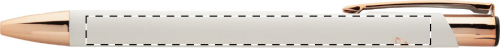 Penna a sfera in alluminio riciclato con finitura gommata, dettagli in color oro rosa e refill blu. Rivestimento speciale per incisione laser a specchio in coordinato colore oro rosa.