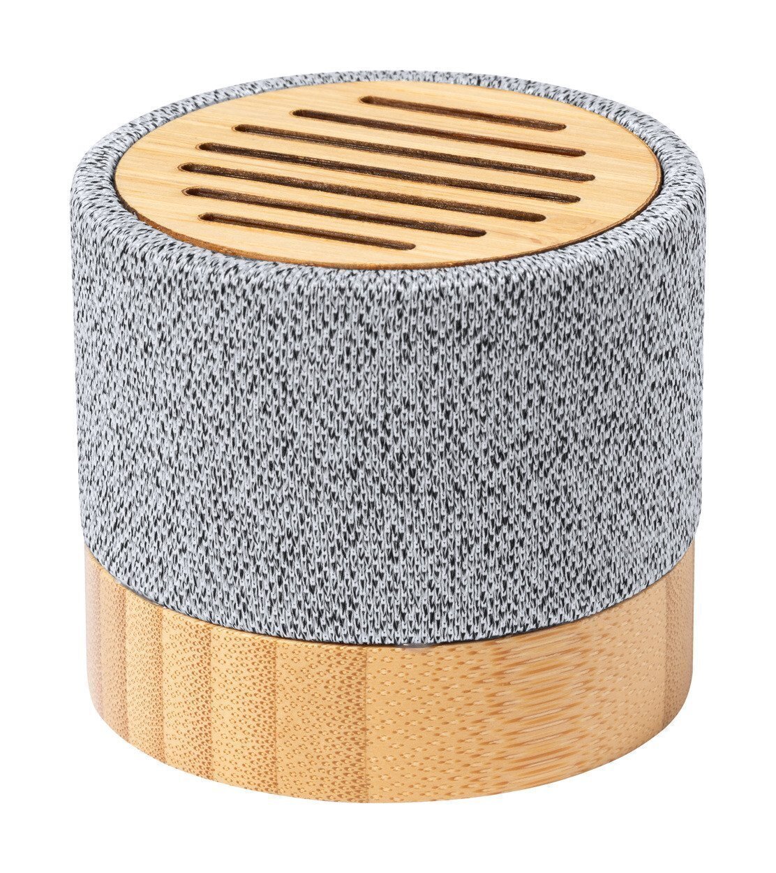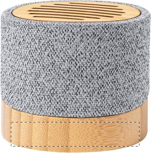 Cassa Bluetooth con struttura in bambù rivestita in tessuto di poliestere RPET e batteria ricaricabile incorporata. Cavo di ricarica USB incluso.