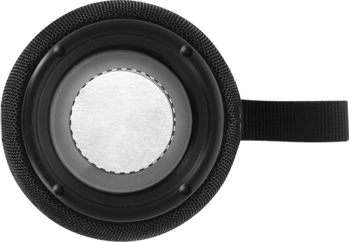 Altoparlante wireless rivestito in tessuto di poliestere con luce LED multicolore e cinghia di trasporto. Con 2 altoparlanti, funzione di chiamata in vivavoce e batteria ricaricabile integrata (1200 mAh). Cavo di ricarica USB incluso.