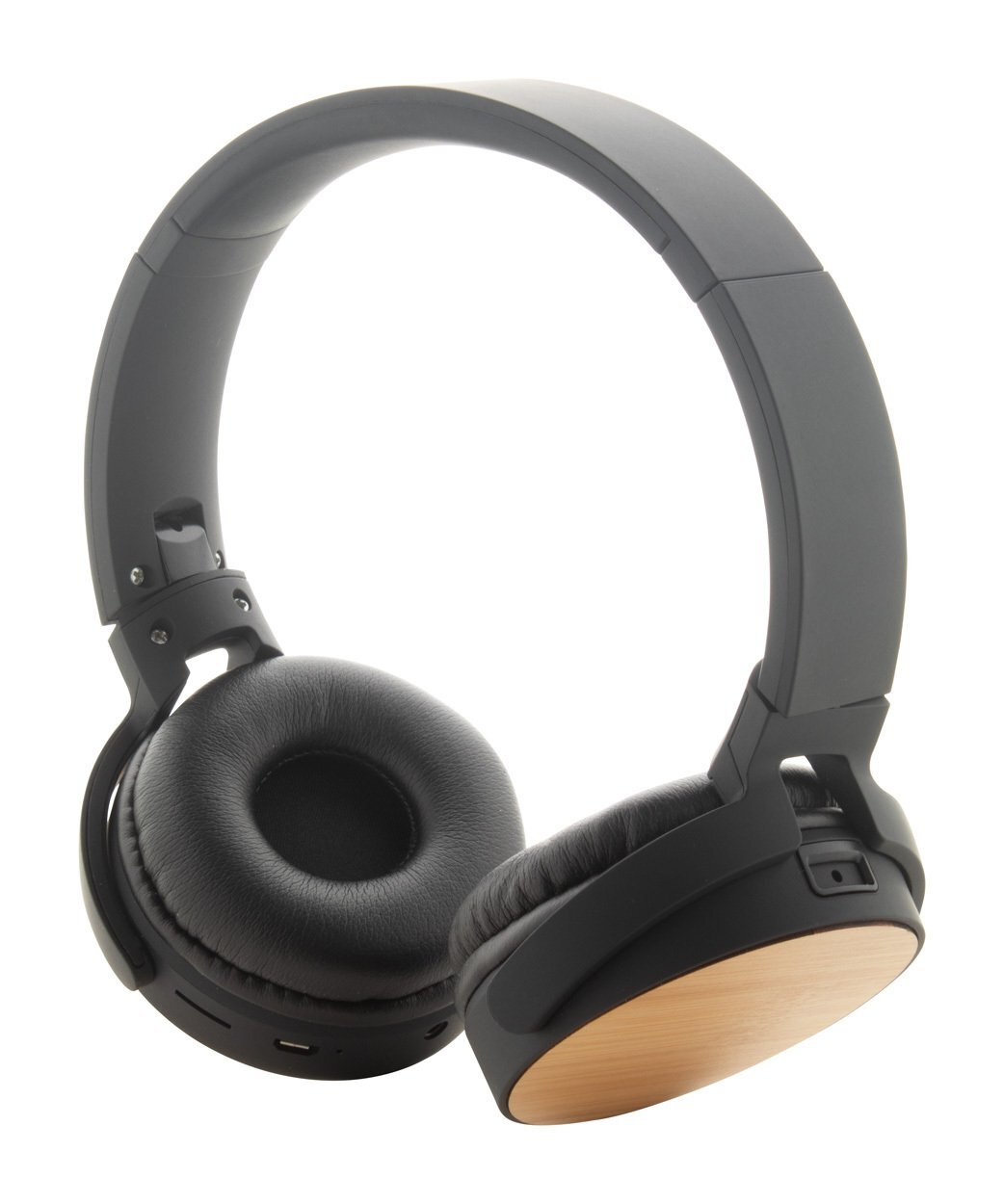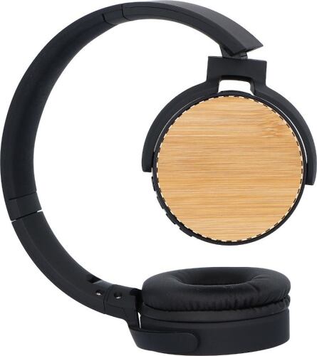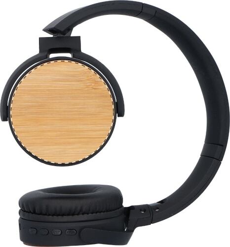Cuffie bluetooth pieghevoli con inserto in bambù, batteria ricaricabile incorporata, funzione di chiamata in vivavoce e riproduzione di micro SD MP3. Jack audio da 3,5 mm e cavi di ricarica USB inclusi.