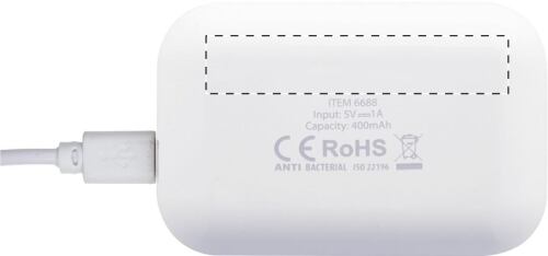 Auricolari wireless bluetooth con funzione di chiamata in viva voce in custodia di plastica antibatterica. Conforme alla normativa ISO 22196. Cavo di ricarica USB incluso.