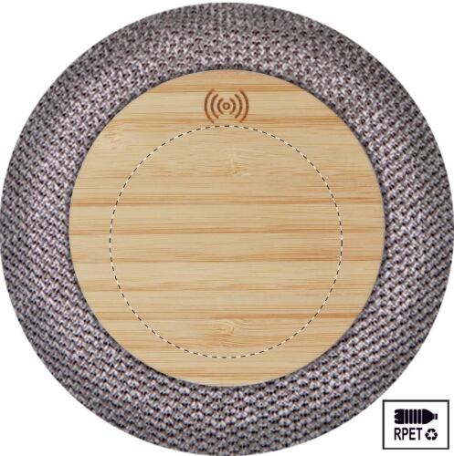 Altoparlante wireless con alloggiamento in ABS riciclato rivestito in tessuto RPET, luce LED nella parte inferiore e caricatore rapido wireless (15W) con piastra in bambù nella parte superiore. Con tracolla in pelle PU, funzione di chiamata in vivavoce e batteria ricaricabile integrata (1200 mAh). Cavo di ricarica USB incluso.