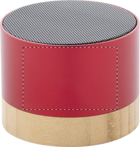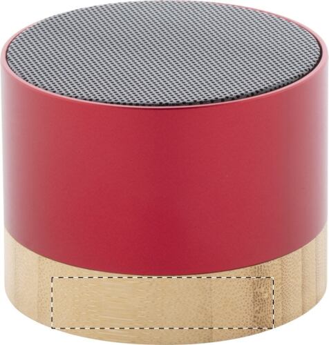 Altoparlante wireless in alluminio riciclato con base in bambù. Con funzione di chiamata in vivavoce e batteria ricaricabile integrata. Cavo di ricarica USB incluso.