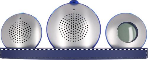 Dittafono in color argento e blu con orologio e radio AM/FM con supporto di plastica blu.
