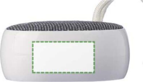 Speaker wireless in ABS riciclato e tessuto rPET con piccolo cavo di trasporto in nylon, capacità della batteria 300 mAh con uscita da 3W, tecnologia wireless versione 5.3 e raggio d'azione di 10 metri, tempo di ricarica di circa 2 ore con un tempo di riproduzione di 2-3 ore, include un cavo di ricarica USB-C bianco da 30 cm, logo rPET sul tessuto e logo ABS riciclato sul lato, confezionato singolarmente in una scatola di cartone avana.