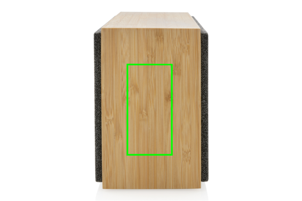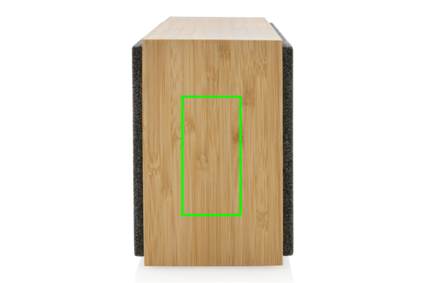Lussuoso speaker da 20W dal suono pulito e bassi potenti. Struttura in bambù certficato FSC100%. I componenti in plastica sono realizzati con ABS riciclato certificato RCS (Recycled Claim Standard). Contenuto totale riciclato: 17 % in base al peso totale dell'articolo. La certificazione RCS garantisce una filiera completamente certificata dei materiali riciclati. Grazie alla tecnologia BT 5.1 garantisce un utilizzo facile e regolare fino a 10 metri ed un basso consumo energetico. La batteria da 4000 mAh consente un'autonomia fino a 6 ore e può essere ricaricata completamente in 3 ore. Include funzione di risposta alle chiamate e microfono. Confezionato in scatola FSC mix. Il cavo di ricarica è in TPE riciclato certificato RCS.
