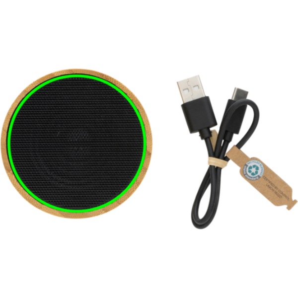 Speaker wireless da 3W realizzato con involucro in bambù 100% FSC® e ABS riciclato certificato RCS (Recycled Claim Standard). Contenuto totale riciclato: 16% in base al peso totale dell'articolo. La certificazione RCS garantisce una filiera completamente certificata dei materiali riciclati. Ha una luce integrata nella parte inferiore ed è dotato di una batteria da 300 mAh per garantire fino a 3 ore di riproduzione e BT4.1 per una connessione fluida e un suono chiaro. Raggio di connessione fino a 10 metri. Include microfono per rispondere alle chiamate. Confezionato in scatola FSC® mix. Compreso di cavo di ricarica in TPE riciclato certificato RCS. Articolo e accessori 100% senza PVC.