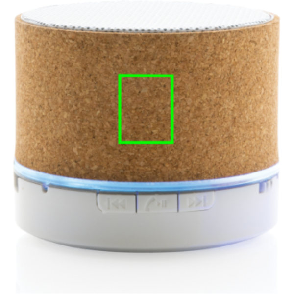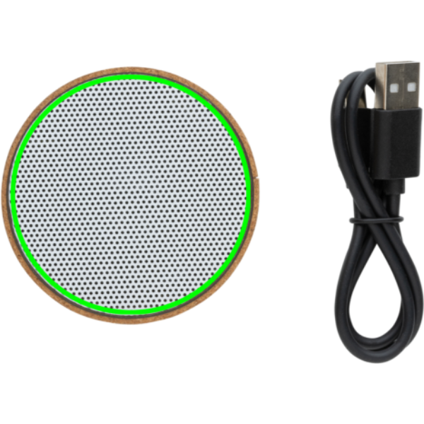 Speaker wireless da 3W realizzato con involucro in sughero FSC® 100%. E' dotato di una batteria da 400 mAh per garantire fino a 3 ore di riproduzione e BT5.1 per una connessione fluida e un suono chiaro. Lo speaker ha una luce integrata quando è acceso. Raggio di connessione fino a 10 metri. Con microfono e funzione di risposta alle chiamate. Confezionato in scatola FSC mix FSC®. Compreso di cavo di ricarica in TPE riciclato certificato RCS. Articolo e accessori 100% senza PVC.