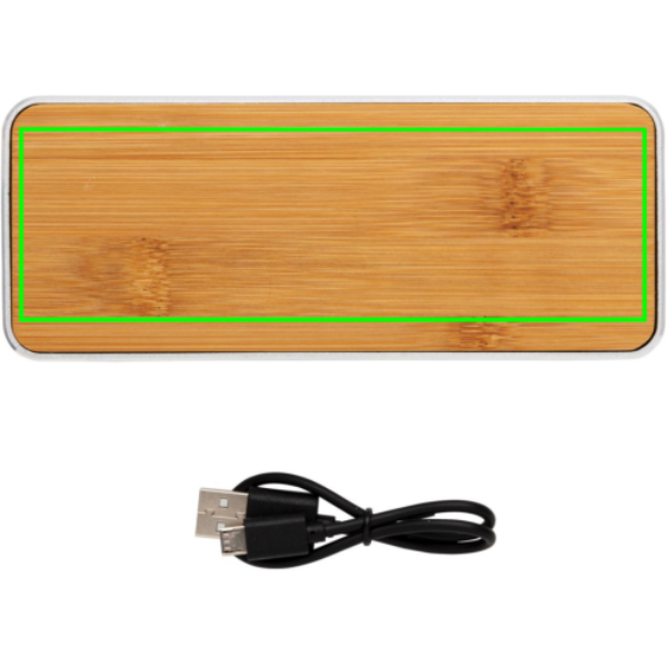 Lussuoso speaker wireless da 3W cje combina alluminio, tessuto e bambù. Grazie alla tecnologia BT 5.0 assicura una connessione stabile e pulita fino a 10 metri. Si ricarica in 1,5 ore. Include un sub-woofer che migliora i bassi. Include cavo di ricarica micro USB in TPEsenza PVC.