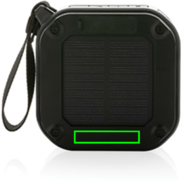 Potente speaker wireless da 3W con pannello solare integrato sul retro, realizzato con ABS riciclato certificato RCS. Contenuto riciclato totale: 38% in base al peso totale dell'articolo. La certificazione RCS garantisce una catena di approvvigionamento dei materiali riciclati completamente certificata. Lo speaker utilizza pannelli solari monocristallini di alta qualità con un tasso di conversione del 19%. La velocità di carica dipende dalle condizioni atmosferiche. Velocità di carica solare: 5V/80mA. E' dotato di una batteria da 400 mAh per garantire fino a 5 ore di riproduzione e di BT5.3 per una connessione fluida e un suono chiaro. Raggio di connessione fino a 10 metri. Con microfono e funzione di riposta alle chiamate. Dispone di una luce LED integrata da 30 lumen. Confezionato in scatola FSC mix FSC®. Incluso cavo di ricarica in TPE riciclato certificato RCS. Articolo e accessori 100% senza PVC. Impermeabile IPX 5.