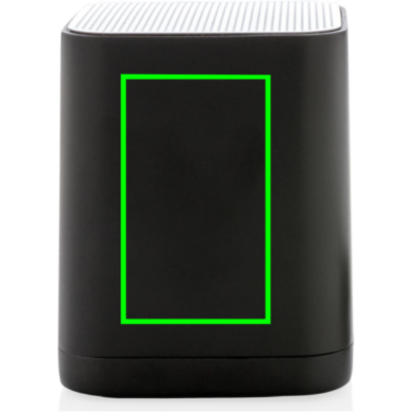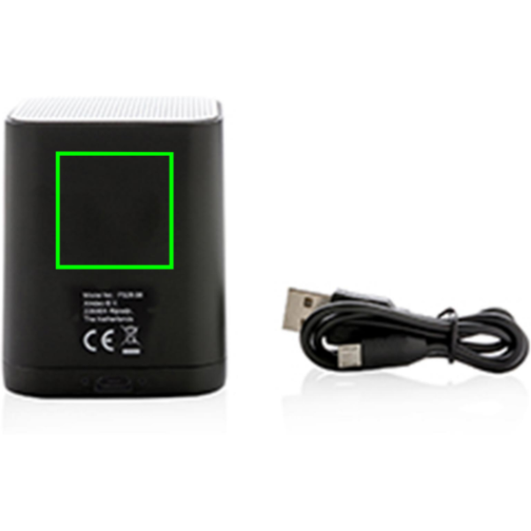 Speaker wireless personalizzabile col vostro logo sulla superficie in ABS. Il logo si illumina mentre lo stai usando, creando la massima visibilità al vostro logo. Grazie alla teconologia BT 4.2 avrai una connessione stabile e pulita fino a 10 metri. La batteria al litio integrata da 400 mAh ti permette di ascoltare la tua musica preferita fino a 4 ore con una carica e si ricarica in sole 1 ora.