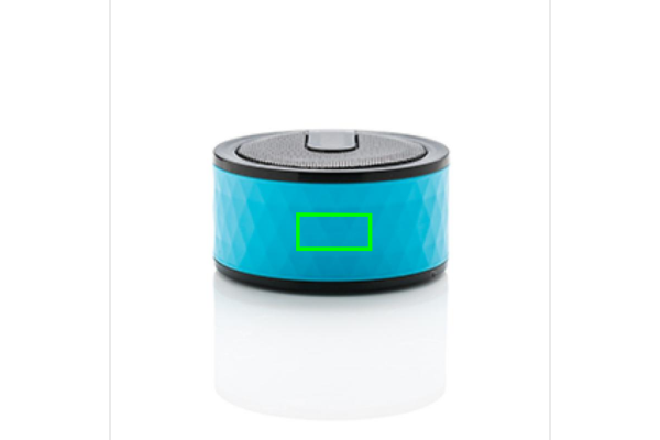 Speaker BT 4.2 in ABS con cassa da 3W con motivi geometrici. Sopra la griglia della cassa è presente un apposito spazio per la personalizzazione. Sul fondo c’è una fascia in silicone che riduce le vibrazioni e migliora quindi la qualità del suono. La batteria al litio da 300 mAh ha autonomia di 4 ore e si ricarica in un’ora. Portata 10 m. Design registrato®