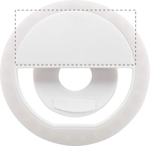 Luce ad anello per selfie in plastica con 28 LED, 3 livelli di luminosità regolabili e batteria ricaricabile incorporata. Incluso il cavo di ricarica USB.