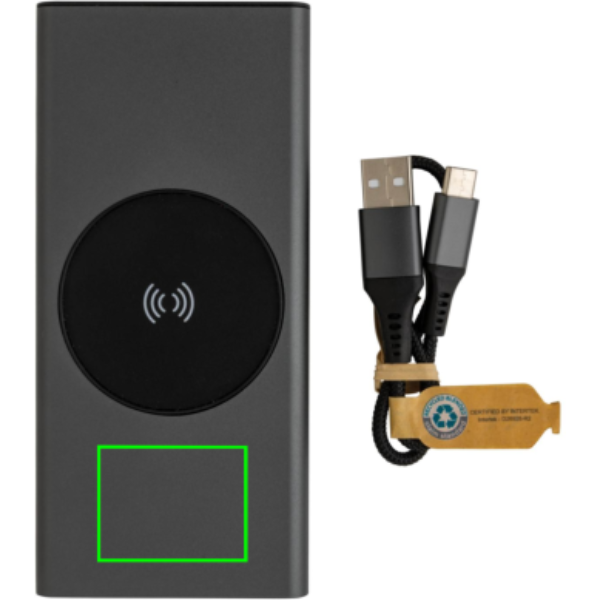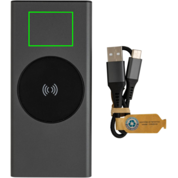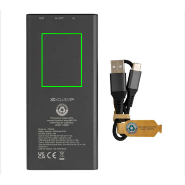 Powerbank a ricarica ultra rapida realizzata con alluminio riciclato certificato RCS (Recycled Claim Standard) e ABS. Contenuto totale riciclato: 28% in base al peso totale dell'articolo. La certificazione RCS garantisce una filiera completamente certificata dei materiali riciclati. La powerbank contiene una batteria ai polimeri di litio di grado A da 10.000 mAh di lunga durata. L'output type C supporta la ricarica rapida fino a 18W e si ricarica in 3 ore. Il caricabatterie wireless supporta la ricarica wireless fino a 10W. Gli indicatori di alimentazione segnaleranno il livello di energia rimanente in modo da sapere sempre quando ricaricare. Articolo e accessori 100% senza PVC. Include cavo di ricarica type C in alluminio riciclato certificato RCS, TPE e PET. Confezionato in scatola FSC® mix. Output USB 5/3A, 9V/2A. 12 V/1,5 A. Output type C 5V/3A, 9V/2A, 12V/1.5A. Type C input: 5V/3A, 9V/2A, 12V/1.5A. Input micro USB: 5V/2A, 9V/2A, 12V/1.5A.