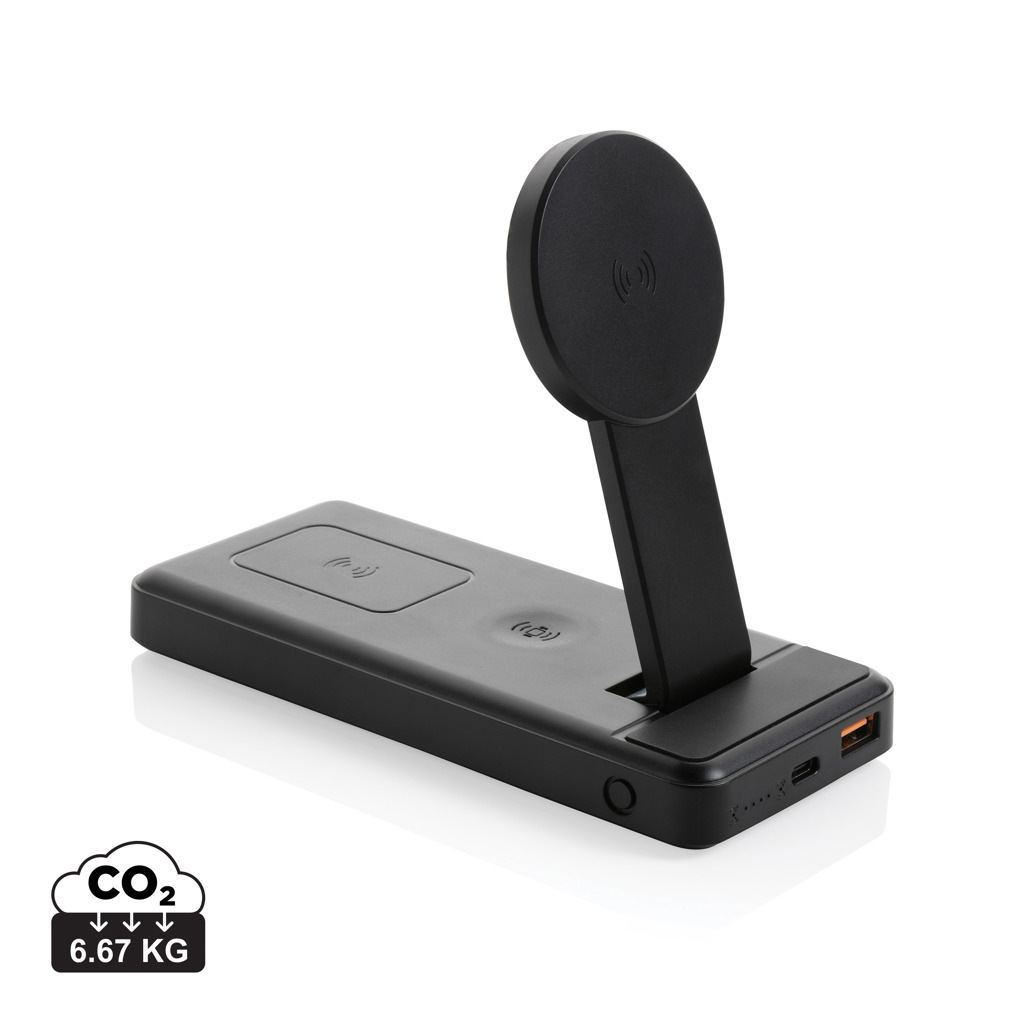 Powerbank 3 in 1 da 10.000 mAh 15W dal design unico, custodia realizzata in ABS riciclato certificato RCS. RCS (Recycled Claim Standard) è uno standard per verificare il contenuto riciclato di un prodotto lungo l'intera catena di fornitura. Contenuto riciclato totale: 22% in base al peso totale dell'articolo. La powerbank contiene una batteria ai polimeri di litio di grado A da 10.000 mAh a lunga durata. La powerbank è dotata di un supporto integrato pieghevole per la ricarica wireless magnetica da 15W e di un caricatore wireless secondario da 5W che può essere usato per piccoli oggetti wireless come le custodie degli auricolari e un terzo caricatore per orologi iOS da 2,5W. Gli indicatori di potenza indicano il livello di energia rimanente, in modo da sapere sempre quando ricaricare. Articolo e accessori senza PVC. Include un cavo di ricarica in TPE riciclato certificato RCS. Confezionato in scatola FSC® mix. Input Type-C 5V2.5A 9V2A 12V1.5A; Output Type C: 5V3A 9V2.22A 12V1