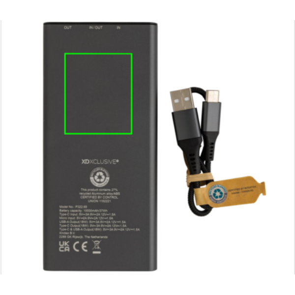 Powerbank a ricarica ultra rapida realizzata con alluminio riciclato certificato RCS (Recycled Claim Standard) e ABS. Contenuto totale riciclato: 27% in base al peso totale dell'articolo. La certificazione RCS garantisce una filiera completamente certificata dei materiali riciclati. L'alluminio non perde le sue caratteristiche nel processo di riciclaggio e può essere riciclato all'infinito. La powerbank contiene una batteria ai polimeri di litio di grado A da 10.000 mAh di lunga durata. La porta di uscita C supporta la ricarica rapida fino a 18 W e anche la ricarica rapida entro 3 ore. Le spie di alimentazione indicheranno il livello di energia rimanente in modo da sapere sempre quando ricaricare. Articolo e accessori 100% senza PVC. Include cavo di ricarica di type C in alluminio riciclato certificato RCS, TPE e PET. Confezionato in scatola FSC® mix. Output USB 5/3A, 9V/2A. 12V/1,5A. Output type C: 5V/3A, 9V/2A, 12V/1,5A. Input type C: 5V/3A, 9V/2A,