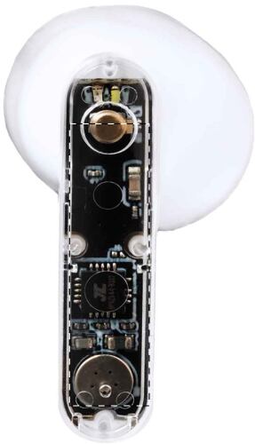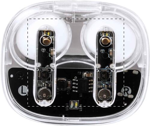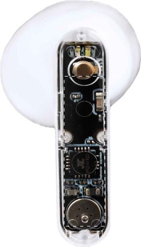Auricolari stereo true wireless (TWS) semitrasparenti con componenti elettronici visibili e funzione di chiamata in vivavoce. In custodia di plastica semitrasparente. Incluso cavo di ricarica USB.