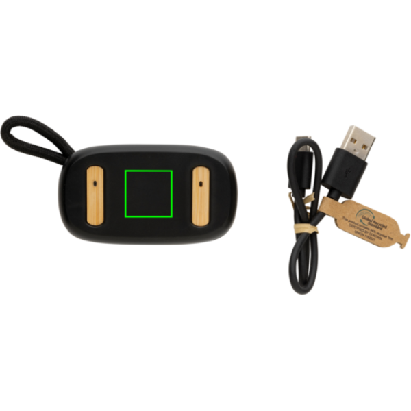 Auricolari true wireless di nuova generazione in bambù FSC® 100% con custodia di ricarica in ABS riciclato RCS. Gli auricolari e la custodia di ricarica sono realizzati con ABS riciclato certificato RCS (Recycled Claim Standard). Contenuto totale riciclato: 58% in base al peso totale dell'articolo. La certificazione RCS garantisce una filiera completamente certificata dei materiali riciclati. Gli auricolari perfettamente aderenti hanno una batteria da 40 mAh e possono essere ricaricati nella custodia di ricarica da 400 mAh in 1 ora. Grazie alla funzione di associazione automatica sarà facile da accoppiare al tuo dispositivo mobile. Tempo di riproduzione a volume medio di circa 5 ore. Con BT 5.3 per una connessione ottimale. Distanza operativa fino a 10 metri. Con pickup e microfono. Include auricolari in silicone di 3 dimensioni. Incluso cavo di ricarica in TPE riciclato certificato GRS. Confezionato in scatola FSC® mix. Articolo e accessori 100% senza PVC.