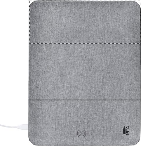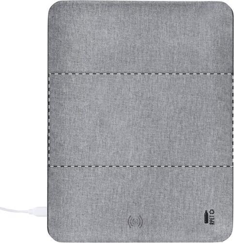 Tappetino per mouse in poliestere RPET con caricatore wireless integrato (10W) e funzione di supporto per il cellulare. Incluso il cavo di ricarica USB.