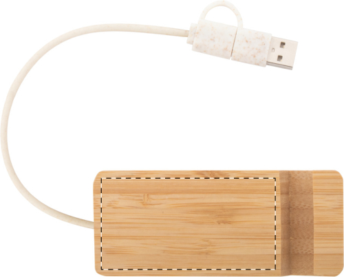 Hub USB in bambù con funzione di supporto per cellulare. Comprende 2 porte USB, una 1 USB-C ed USB 2.0. Incluso cavo con connessioni USB e USB-C.