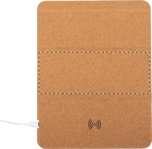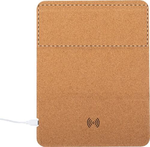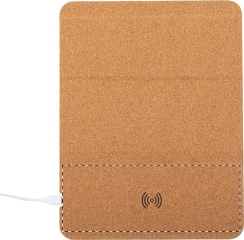 Tappetino per mouse in sughero naturale con caricabatterie wireless (5W) e porta cellulare integrato. Cavo di ricarica USB incluso.