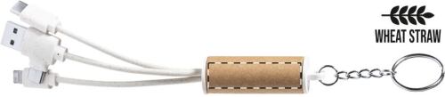 Portachiavi con cavo di ricarica USB in carta riciclata e plastica di paglia di grano con connettori micro USB, USB-C e Lightning. Con ingressi USB e USB-C.