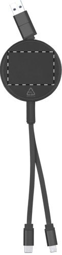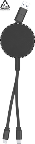 Telescopico cavo di alimentazione USB in alluminio riciclato con connettori micro USB, USB-C, Lightning ed ingressi USB e USB-C.