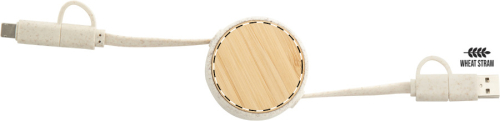 Cavo di ricarica USB telescopico in plastica ecologica di paglia di grano e bambù. Con connettori micro USB, USB-C, Lightning, ed ingressi USB e USB-C.