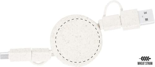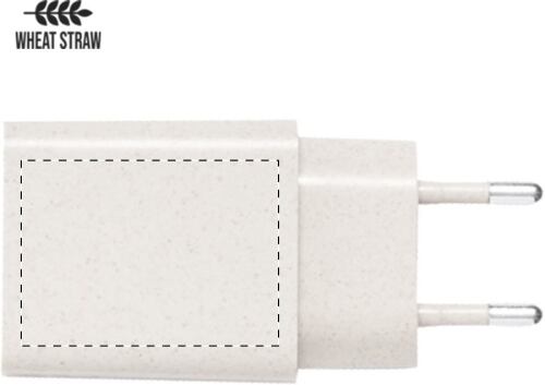 Caricabatterie USB in plastica ecologica di paglia di grano confezionato in un sacchetto di cotone. Il set si compone di: caricatore da parete USB a ricarica rapida con 1 porta USB e 1 porta USB-C e spina europea a 2 poli. Supporta la tecnologia di ricarica rapida (PD20W / QC3.0). Cavo di ricarica USB telescopico con connettori micro USB, USB-C e Lightning ed ingressi USB e USB-C.